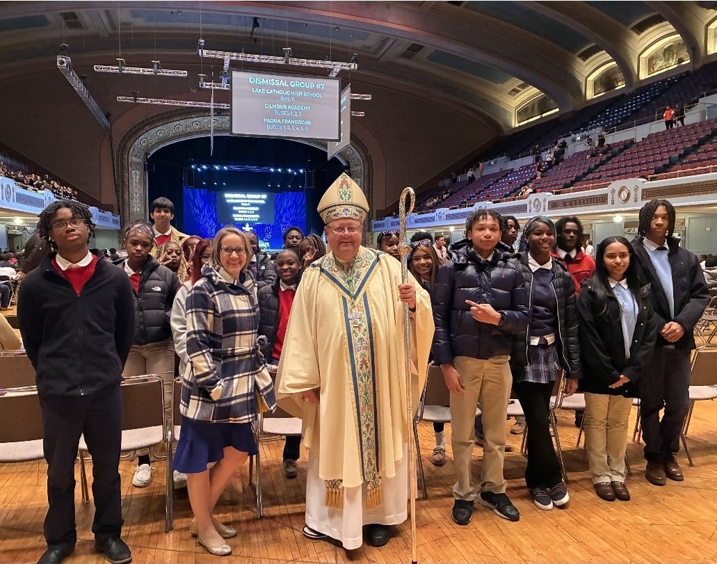 VASJ’s entire student body joined nearly 5,000 people at the event. Students, faculty and staff traveled downtown on 10 buses to worship with students from all 20 Catholic high schools in the Diocese of Cleveland. Students listened to a witness of faith by one of their peers and heard from speaker and writer Meg Hunter-Kilmer of Notre Dame Campus Ministry. Bishop Ed Malesic celebrated Mass along with many Diocesan priests, deacons and seminarians.